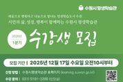 광장일보 나학천 기자 | 수원시평생학습관이 12월 17일 오전 10시부터 2026년 1분기 수강생을 모집한다. 1월부터 3월까지 운영되는 1분기 강좌는 ▲첨단미래기술 프로그램 ▲디지털 지식정보 프로그램 ▲생활문화 프로그램 ▲교양 프로그램 ▲인문 프로그램 ▲기관 협력 재능기부 프로그램 ▲거북이공방 프로그램 ▲대상별 맞춤프로그램 ▲시민교육 프로그램 ▲언제든학교 시민기획 프로그램 ▲무지한스승의만남 시민참여기획 프로그램 등 총 11개 과정, 115개 세부 강좌로 구성됐다. 첨단미래 기술 프로그램을 강화했다. 인공지능(AI) 기술에 초점을 둔 첨단미래기술 프로그램, 성균관대학교 지능로봇리빙랩과의 협업을 통한 자율주행 실습, 가상현실(VR)드론 시뮬레이션 체험 등이 있다. 또 글쓰기, 사주명리학, 한글 서예, 현대미술, 명화감상, 뮤지컬 등을 주제로 한 교양 프로그램과 중장년, 시니어, 제2의 인생설계, 청소년 등을 대상으로 하는 대상별 맞춤 프로그램을 마련했다. 수원시는 새빛톡톡 시민 설문조사를 활용해 2026년 강사를 공개 모집했고, ▲생활문화 프로그램 ▲디지털 지식정보 프로그램 ▲대상별 맞춤프로그램 ▲