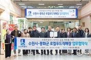 광장일보 나학천 기자 | 수원특례시와 봉화군농어업회의소는 19일 수원시청에서 로컬푸드 입점 협약을 체결했다. 협약식은 이날 시청 별관 앞에서 열린 ‘봉화 수원 캠핑장 개장 기념 농산물 직거래장터’에서 진행됐다. 수원시는 인구소멸 위기 지역 농가의 안정적 판로 확보를 지원하고, 시민에게 신선한 지역 농산물을 제공할 예정이다. 협약식에는 남상은 수원시 농업기술센터 소장, 김주익 봉화군농어업회의소 회장, 신종길 봉화군 농업기술센터 소장 등이 참석했다. 봉화 수원 캠핑장 개장 기념 농산물 직거래장터에는 수원시·봉화군·수원농협·하나로마트 수원점이 참여했다. 수원로컬푸드직매장은 상추·배추·표고버섯 등 농산물을, 봉화군은 사과·생강·고구마·마 등 주요 특산물을 판매했다. 하나로마트 수원점은 감, 인삼, 대추, 새우젓, 멸치 등 통영·사천·김천 등의 농산물을 판매했다. 방문객에게 정다미 500g 200개와 장바구니 200개를 제공하는 행사도 진행했다. 수원시 관계자는 “수원시민에게 신선한 로컬푸드를 제공하고, 인구소멸 위기 지역 농가와 상생 협력할 수 있는 기반을 마련했다”며 “지역 농가와 시민 모두