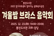 광장일보 이현나 기자 | 김포시 통진도서관은 오는 12월 23일 저녁 7시부터 8시까지 다가오는 연말을 기념하여 온 가족이 함께 즐길 수 있는 브라스 음악공연을 운영한다. 이번 공연은 경기아트센터에서 지원하는 ‘찾아가는 문화복지공연’ 사업으로, 김포시 북부권 시민들을 대상으로 일상 가까이에서 문화예술을 만나는 기회를 제공하고, 지역 간 문화 격차를 완화하고자 기획했다. 이번 공연은 금관 5중주로 구성된 앙상블 코리안아츠의 풍성한 선율로 채워질 예정이며, 코리안아츠는 대한민국 국제관악제 홍보대사와 2018년 평창동계올림픽 개막식 《승리의 팡파레》를 연주하는 등 화려한 이력을 지닌 팀으로, 클래식은 물론 영화와 대중음악 등 다양한 장르를 넘나들며 새로운 음악적 시도를 이어가고 있다. 도서관 관계자는 “이번 공연은 영화 및 애니메이션 음악공연으로 누구나 쉽게 즐길 수 있으며, 이번 공연을 통해 온 가족이 따듯한 연말을 보내길 바란다”라고 말했다.