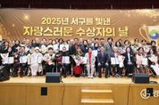 광장일보 이현나 기자 | 대전 서구는 17일 구청 구봉산홀에서 한 해 동안 지역사회 각 분야에서 헌신하며 서구 발전에 기여한 구민들의 공로를 기리는 ‘2025년 서구를 빛낸 자랑스러운 수상자의 날’ 행사를 개최했다. 이번 행사는 수상자와 가족, 내빈 등 400여 명이 참석한 가운데 원활한 진행을 위해 오전과 오후 두 차례로 나뉘어 진행됐다. 오전 1부 행사에서는 87명의 구민이 표창을 받았다. 6·25전쟁 무공에 대한 화랑무공훈장 전수를 비롯해 △공중위생 무료 봉사 △전통시장 활성화 △청소년 범죄 예방 △치매 관리 사업 등 주민의 안전과 건강 증진을 위해 힘써온 유공자들이 수상의 영예를 안았다. 이어 열린 오후 2부 행사에서는 126명의 구민이 수상했다. 지방자치 발전 유공 국무총리상을 비롯해 △구정 발전 △도시재생 △탄소중립 실천 △산불 방지 △지역자율방재단 활동 정책 실천 및 재난 안전 분야에서 활약한 구민들이 포함됐다. 구 관계자는 “수상자 한 분 한 분의 묵묵한 헌신과 노력이 모여 오늘의 서구를 만들었다”며 “앞으로도 구민과 함께 지혜를 모아 구정 발전을 위해 노력하겠다”고 전했
