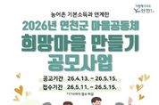 광장일보 주재영 기자 | 연천군 마을공동체지원센터가 농어촌기본소득과 연계한 ‘2026년 희망마을 만들기 주민공모사업’ 참여 공동체를 모집한다. ‘희망마을 만들기 공모사업’은 지역의 인적·물적 자원을 활용해 주민 스스로 마을의 문제점을 발굴하고 해결 방안을 모색해 실행할 수 있는 마을 단위의 주민 주도형 공동체 활동 지원사업으로, 총 10개 공동체를 선정해 팀당 최대 200만 원을 지원할 계획이다. 올해 희망마을 만들기 공모사업은 5월 중 1차 서류심사 및 2차 발표심사를 거쳐 6월 최종 선정되며, 기존과는 다르게 이음메이커(공동체지원활동가)를 공동체와 연계해 현장 밀착형 지원을 강화한다. 이음메이커는 사업 추진 과정에서 공동체가 어려움을 겪는 정산 업무와 운영 방향 설정을 함께 고민하고, 실질적인 활동 역량을 높일 수 있도록 맞춤형 지원을 제공할 예정이다. 신청 대상은 농어촌기본소득을 수급하는 5인 이상의 주민 모임이며, 환경·생태, 돌봄·나눔, 마을 경제, 마을 기록 등 다양한 분야의 활동이 가능하다. 특히 단순 행사나 일회성 사업은 제외하고, 지속가능성과 공익성을 갖춘 공동체 활동