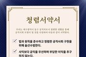 광장일보 주재영 기자 | 대구 동구청은 청렴 문화 확산과 공직기강 확립을 위해 청렴한 생활을 통해 모범이 될 것을 다짐하는 ‘청렴서약서’를 제작해 구청 부서 및 동행정복지센터 출입구에 부착했다. 서약서에는 △법과 원칙 준수 △공익 우선 △금품·향응 수수 금지 △공정하고 객관적인 직무 수행 등의 내용이 담겼다. 김태운 동구청장 권한대행은 “청렴은 선택이 아닌 공직자가 갖춰야 할 가장 중요한 가치”라며 “전 직원이 책임감을 느끼고 구민들에게 신뢰받는 투명한 행정을 펼쳐 나가겠다”고 말했다.