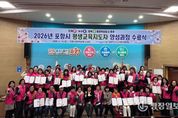 광장일보 주재영 기자 | 포항시는 지난 10일 평생학습원 소강당에서 수료생 44명을 대상으로 ‘2026년 포항시 평생교육지도자 양성과정’ 수료식을 가졌다. 이번 교육은 지난 3월 18일부터 4월 10일까지 총 15회(45시간)에 걸쳐 진행됐다. 교육 과정은 ▲평생교육 및 평생교육지도자 이해 ▲마을 평생교육 프로그램 기획 및 운영 ▲평생학습도시 비교 견학 등 실무 역량 강화에 중점을 두고 전문 인력을 양성하는 체계적인 과정으로 구성됐다. 이날 수료식에는 조현미 평생학습원장, 박진숙 평생교육과장, 김용재 평생교육지도자협의회장 등이 참석해 수료생들을 축하했으며, 전체 수료생 44명을 대표해 최설옥 씨가 수료증을 받았다. 조현미 평생학습원장은 “지속가능한 평생학습도시 조성을 위해서는 현장에서 발로 뛰는 지도자들의 역할이 무엇보다 중요하다”며 “앞으로도 민·관 협력을 통해 교육 소외계층 해소에 노력하고 마을 단위 평생학습이 활성화될 수 있도록 적극 지원하겠다”고 말했다. 한편, 포항시 평생교육지도자협의회는 민간 주도의 평생학습 활성화를 위해 찾아가는 동경대학 운영, 민·관·군 행복학습센터 운영