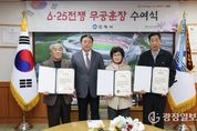 광장일보 주재영 기자 | 김해시는 10일, 6·25전쟁에 참전하여 혁혁한 전공을 세웠음에도 전후 혼란한 상황으로 인해 그동안 훈장을 받지 못했던 故김성수 하사, 故김동준상병, 故유경춘 상병 유족에게 국방부장관을 대신해 화랑무공훈장을 전수했다. 이는 국방부와 육군이 추진하는 ‘6·25 무공훈장 찾아주기 사업’을 통해 약 70여년만에 명예를 되찾아드린 의미 있는 자리였다. 故김동준 상병은 1952년 20세의 나이에 입대하여 강원 철원지구 전투에서 전사했다. 故유경춘 상병은 1952년 22세의 나이에 입대하여 강원 철원지구 전투에서 혁혁한 공을 세웠다. 또한 故김성수 하사는 1950년 19세의 나이에 입대하여 강원 금화지구 전투에서 큰 전공을 세웠다. 훈장을 전수받은 유족들은 "조국을 위해 헌신하신 선친들의 명예를 70년 만에 되찾아주신 것에 깊이 감사드리며, 이런 뜻깊은 자리를 마련해주신 시에도 감사드린다”고 말했다. 홍태용 김해시장은 “이제라도 참전유공자분들의 고귀한 희생을 기리고 명예를 회복시켜 드릴 수 있어 기쁘고 영광스럽다. 국가유공자들의 합당한 예우를 강화하고 그 명예를 드높이는데
