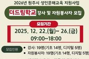 광장일보 이현나 기자 | 원주시 평생교육원 학습관에서 12월 22일부터 26일까지 2026년 원주시 성인문해교육 지원사업 '더드림학교' 강사 및 자원봉사자를 모집한다. 이번 문해교육 강사는 학령기 교육의 기회를 놓친 비문해 성인을 대상으로 더디딤 6개반, 더채움(성인생활문해) 5개반, 더열림(찾아가는 성인문해교실) 3개반, 더터치(디지털문해) 5개반 등 전문적인 문해교육을 수행할 교육강사 19명, 자원봉사자 19명, 총 38명을 모집한다. 지원자는 신청서를 작성해 평생교육원 학습관에 방문 접수하면 되고, 선발은 1차 서류 심사와 2차 면접 및 수업 시연으로 이루어진다. 심사에서는 ▲강사 경력 및 자격 ▲강좌 운영 적합성 ▲지원자의 전문성 ▲강의 계획의 적정성 ▲강의 능력 등을 종합적으로 평가해 최종 합격자를 선정한다. 윤석재 학습관장은 “비문해 어르신들에게 질 높은 문해교육을 제공하여 학습자들의 자존감 향상에 기여할 역량 있는 강사와 자원봉사자의 많은 관심과 참여를 기대한다.”라고 말했다.