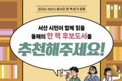 광장일보 주재영 기자 | 충남 서산시는 오는 1월 6일부터 2월 14일까지 2026년 범시민 한 책 읽기 운동의 후보 도서를 추천받는다고 밝혔다. 범시민 한 책 읽기 운동은 매년 대표 도서를 선정하고, 다양한 독서 행사를 통해 지역 독서 운동을 촉진하는 사업이다. 시는 일반 부문과 아동 부문에 각 1권을 대표 도서로 선정할 계획이다. 추천 도서는 장르와 형식에 상관없이 국내 작가의 작품 중 각종 독서 문화 행사로 활용할 수 있는 도서다. 시립도서관, 시립도서관 대산분관, 공립 작은 도서관에 방문해 추천서를 작성하거나 서산시립도서관 누리집 및 홍보물에 있는 큐아르코드(QR코드)를 활용해 추천하면 된다. 시 관계자는 “한 책 읽기 사업을 통해 책으로 하나 되는 서산시를 만들 수 있도록 올해의 대표도서 선정에 많은 관심과 참여를 바란다”라고 말했다.