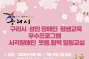 광장일보 주재영 기자 | 사단법인 경기도시각장애인연합회 구리시지회는 구리시와 경기도의 지원을 받아 2026년 5월부터 ‘시각장애인 웃음·활력 힐링 교실’을 운영할 예정이라고 밝혔다. 이번 프로그램은 시각장애인 어르신들의 정서적 안정과 신체 활력 증진, 사회적 교류 확대를 위해 마련됐다. 웃음 치료를 비롯해 전신 몸풀기 동작, 요가, 율동 등 다양한 활동을 통해 몸과 마음을 함께 돌볼 수 있도록 구성했다. 특히 참여 중심으로 운영해 어르신들이 자연스럽게 소통하고 교류할 수 있도록 지원하며, 이를 통해 사회적 고립감 완화와 공동체 의식 형성에도 긍정적인 변화를 기대하고 있다. 웃음과 신체활동이 어우러진 프로그램을 통해 스트레스를 줄이고 일상에 활력을 더하는 시간이 될 전망이다. 이번 사업은 시각장애인을 위한 맞춤형 평생학습 프로그램으로, 5월부터 선착순 8명을 대상으로 총 8회 과정으로 운영된다. 건강과 정서 지원을 함께 아우르며 지역사회 내 포용적 평생학습 환경 조성에도 의미를 더하고 있다. 또한 오는 10월에는 평생학습 축제에 참여해 프로그램 운영 성과를 공유하고 시민들과 소통하는 자리도 마련할 예