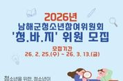 광장일보 주재영 기자 | 남해군은 2026년 지역 청소년 정책을 함께 만들어 갈 청소년참여위원회 신규 위원을 모집한다고 밝혔다. 청소년참여위원회 ‘청바지’(청소년을 위한 청소년이 바라는 청소년들에 의한 지역사회)는 청소년 관련 정책과 사업을 제안하고, 사업 추진 과정에 주체적으로 참여하는 청소년 참여 기구다. 청소년의 권익 증진과 실질적인 정책 반영을 위해 운영 되며, 학교 생활, 진로, 문화활동, 복지, 안전 등 청소년의 삶과 밀접한 다양한 분야를 다룬다. 위원으로 선발되면 정기회의와 분과활동에 참여하여, 정책 제안서 작성, 간담회 참석, 지역 행사 및 캠페인 활동 등을 수행하게 된다. 특히 청소년의 시각에서 지역 현안을 바라보고 개선방안을 제시하는 과정은 참여 청소년들에게 뜻깊은 경험이 될 것으로 기대된다. 모집 대상은 지역 내 거주하거나 재학 중인 청소년으로, 평소 지역사회의 정책 활동에 관심이 있거나 다양한 경험을 희망하는 청소년이면 누구나 지원이 가능하며, 총 20명을 선발할 예정이다. 청소년은 공개모집과 학교와 기관 추천을 병행해 선발하며, 활동기간은 4월부터 1