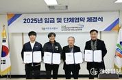 광장일보 주재영 기자 | 여주도시공사와 민주노총 공공운수노조 여주도시공사지회는 12월 9일 여주도시공사 사옥에서 2025년 임금 및 단체협약 체결식을 개최했다고 밝혔다. 이번 협약은 상호 신뢰와 존중을 바탕으로 진행된 성실한 교섭의 결실로, 노사 상생과 지속 가능한 발전을 위한 중요한 발판이 될 전망이다. 공사와 노동조합은 이번 협약을 통해 직원들이 안정적인 근무여건 아래 역량을 발휘할 수 있는 환경을 조성하고, 공공기관으로서 사회적 책임을 다하기 위한 제도 개선과 협력 체계를 강화해 나갈 방침이다. 임명진 사장은 “이번 임금·단체협약은 노사 간 소통과 이해를 바탕으로 이루어낸 결실”이라며, “앞으로도 신뢰 기반의 노사 협력을 통해 시민에게 더 나은 공공서비스를 제공할 수 있도록 노력하겠다"고 밝혔다. 여주도시공사는 앞으로도 합리적인 노사관계 정착을 위해 소통과 협력을 강화하고, 시민 중심의 공기업으로서 책임과 역할을 다하기 위한 다양한 노력을 이어갈 계획이다.