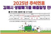 광장일보 주재영 기자 | 김해시는 다가오는 추석 연휴 기간 시민과 귀성객이 쾌적한 환경에서 명절을 보낼 수 있도록 생활폐기물 처리 대책을 시행한다고 30일 밝혔다. 올해 추석 연휴는 10월 3일부터 10월 9일까지이며, 생활폐기물과 음식물쓰레기는 정상수거일 전일 20시 이후부터 배출 가능하다. 수거 대행업체의 휴무일은 10월 4일, 10월 6일, 7일이다. 시는 연휴 기간 특별 상황반을 운영해 시민 불편을 최소화하고, 무단투기․불법 소각 단속도 강화할 계획이다. 이치균 자원순환과장은 "가족과 함께하는 명절에 불편이 없도록 수거와 홍보에 만전을 기하겠다.며, "배출일을 꼭 지켜주시고, 재활용품 분리배출과 음식물쓰레기 감량에 적극 협조 해달라.고 당부했다.