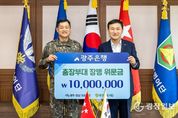 광장일보 주재영 기자 | 광주은행은 26일, 77주년 국군의 날을 앞두고 지역방위 책임사단인 제31보병사단(사단장 이일용)을 방문해 위문금 1천만원을 전달하고 장병들을 격려했다고 밝혔다. 이날 전달식에는 고병일 광주은행장, 이일용 제31보병사단 사단장 및 관계자가 참석한 가운데, 지역 안보의 최일선에서 헌신하는 장병들의 노고에 감사를 전하는 뜻깊은 시간을 가졌으며, 전달된 위문금은 장병들의 복지 증진과 사기 진작을 위해 사용될 예정이다. 고병일 광주은행장은 “지역민들이 안심하고 일상을 누릴 수 있는 것은 국토방위를 위해 헌신하는 장병 여러분 덕분이다”라며, “광주은행은 지역 대표은행으로서 ESG경영을 기반으로 다양한 사회공헌 활동을 지속적으로 확대해 나가겠다”고 말했다. 한편, 광주은행은 매년 제31보병사단을 방문해 위문활동을 이어오고 있으며, 군 장병 적금 및 전용 제휴카드 출시 등 맞춤형 금융서비스 제공에도 앞장서고 있다.