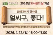 광장일보 주재영 기자 | 김포시 마산도서관은 제4회 도서관의 날을 맞아 오는 4월 12일 오후 4시부터 5시까지 마산도서관 3층 다목적실에서 전래이야기 한마당 '얼씨구, 좋다!'를 운영한다. 4월 12일은 '도서관법'에 따라 도서관에 대한 국민의 이해와 관심을 높이고 이용을 촉진하기 위해 지정된 ‘도서관의 날’이다. 시는 이를 기념해 가족 단위의 관람객이 즐길 수 있는 공연을 마련했다. 공연은 밴드 ‘판’이 진행하며, 건반과 베이스, 기타, 장구 등 다양한 악기를 활용해 전래동화를 음악으로 재구성한 무대다. 혹부리 영감, 별주부전 등 친숙한 이야기를 노래와 연주로 풀어내며, 옛 동요와 국악 장단을 활용한 창작곡도 함께 선보일 예정이다. 이번 공연은 김포시민 100명을 대상으로 하며, 3월 24일 오전 10시부터 김포시 통합예약 홈페이지를 통해 신청할 수 있다.