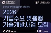 광장일보 주재영 기자 | 인천테크노파크(인천TP)는 지역 제조벤처기업의 기술경쟁력 강화를 위해 ‘2026년 기업수요 맞춤형 기술개발사업’의 참여기업을 오는 3월 16일까지 모집한다고 밝혔다. 이번 사업은 인천 소재 제조벤처기업 중, 최근 5년 이내에 민간 액셀러레이터(AC)나 벤처캐피탈(VC) 등 적격 투자기관으로부터 투자를 유치한 기업을 대상으로 한다. 총 6개 내외의 과제를 선정해 기업당 최대 7,500만 원의 기술개발비를 지원할 계획이다. 지원금은 신규 채용 인건비, 전문가 활용비, 시제품 제작 및 성능 시험·평가 등 사업화와 상용화에 필요한 제반 비용으로 활용할 수 있다. 특히 선정 기업은 스케일업TIPS 운영사를 통해 지식재산권(IP) 경영진단 등의 컨설팅을 받게 된다. 이 중 성과가 우수한 기업은 스케일업TIPS 운영사로부터 10억 원 규모의 직접 투자와 함께 스케일업TIPS 프로그램 추천 기회를 얻을 수 있다. 최종적으로 스케일업TIPS에 선정되면 향후 3년간 총 20~30억 원의 R·D 자금을 후속 지원을 받을 수 있다. 사업 신청은 3월 16일