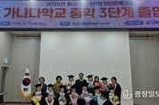광장일보 나병석 기자 | 화성특례시는 17일 화성시평생학습관에서 ‘2025년 학력인정 성인문해교실 가나다학교 졸업식’을 개최했다. 학력인정 성인문해교실 가나다학교는 사회적·경제적 이유로 학령기 배움의 기회를 놓친 만 18세 이상 비문해·저학력자를 대상으로 문해 교육을 진행하는 프로그램이다. 시는 지난 2020년 12월에 교육부 학력 인정 문해교육 프로그램 운영 기관으로 지정된 이후 학력 인정 성인문해교육을 운영하고 있으며, 올해는 지난 3월 4일부터 12월 11일까지 연 450시간의 교육과정으로 진행됐다. 시는 지난 2022년 초등 3단계 졸업생 15명, 2024년 초등 3단계 졸업생 11명을 배출한 데 이어, 올해는 처음으로 중학 3단계 졸업생 11명을 배출했다. 또한, 중학 1단계는 8명이, 초등 1단계는 9명이 수료했다. 졸업식에서는 학습자 및 가족, 강사들이 참석한 가운데, 중학과정을 마친 졸업생들에 대한 졸업장과 상장 수여, 모범 졸업생 경기도교육감 표창장 수여 등이 진행돼 학습자들의 성과를 함께 축하하고 졸업의 기쁨을 나누는 시간을 가졌다. 학습자 대표는 “가나다학교가 없었다