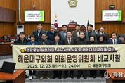 광장일보 주재영 기자 | 해운대구의회 의회운영위원회는 지난 12월 23일부터 24일까지 1박 2일간의 일정으로 경주시 일원을 방문해 선진 의회 시설을 비교·분석하고 의정 역량 강화를 위한 벤치마킹을 실시했다. 이번 시찰에는 김상수 의회운영위원장과 해운대구의회 의장을 포함한 의원 10명, 의회사무국 직원 4명 등 총 14명이 참여했다. 시찰단은 24일 오전 경주시의회를 공식 방문하여 약 3년 전 전면 리모델링을 통해 현대화된 청사 시설을 중점적으로 둘러보았다. 시찰단은 특히 본회의장과 각 상임위원회 회의실이 최신식 설비로 갖춰진 점과, 각 상임위원장실이 별도로 마련되어 있고 넓고 쾌적한 의원 사무실이 조성되어 있는 등 의정 활동을 지원하는 인프라가 매우 우수하다는 점에 주목했다. 현장을 둘러본 의원들은" 경주시의회의 경우 상임위원장실과 의원 연구 공간이체계적으로 분리·배치되어 있고, 회의실 시설 또한 현대적으로 개선되어 있어 의정 활동의 효율성을 높이는 데 크게 기여하고 있다"고 평가했다. 또한, 직원들의 사무 공간이 업무 집중도를 높일 수 있도록 효율적으로 배치된 점과 모든 직원이 명찰