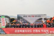광장일보 이현나 기자 | 강원특별자치도는 3월 30일 오전 11시 춘천시 동내면 고은리 일원에서 ‘강원특별자치도 신청사 착공식’을 개최했다. 착공식에는 김진태 도지사를 비롯해, 한기호 국회의원(춘천‧철원‧화천‧양구을), 김시성 도의장, 신영재 홍천군수, 이병선 속초시장, 이상호 태백시장, 양양부군수, 지역 주민대표 등 1천여 명이 참석했다. 신청사 건립사업은 약 5,000억 원 사업비가 투입되며, 도민 중심의 복합행정문화공간으로 조성된다. 신청사는 약 10만㎡ 부지에 지하 2층, 지상 9층 규모로 건립되며, 다목적 강당과 전면 광장, 옥상정원 등을 갖춰 도민이 언제나 찾아와 소통하고 이용할 수 있는 열린 공간으로 조성된다. 특히 기존 청사의 주요 불편사항으로 지적됐던 주차난 해소를 위해 1,600대 이상 수용 가능한 주차공간을 확보하는 등 도민 편의 증진과 행정 효율성 제고를 동시에 고려한 스마트 청사로 건립된다. 도는 이번 부지 조성 및 진입도로 등 기반시설 공사를 시작으로 올해 하반기 본격적인 건축공사에 착수해 2029년 준공을 목표로 사업을 추진할 계획이다. 김진태