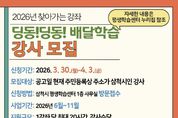 광장일보 이현나 기자 | 삼척시는 3월 30일부터 4월 3일까지 ‘2026년 찾아가는 강좌 딩동! 딩동! 배달학습’ 강사를 모집한다고 밝혔다. ‘딩동! 딩동! 배달학습’은 지역 내 유휴 학습공간을 활용해 학습자가 원하는 시간과 장소로 전문 강사가 직접 찾아가 교육을 제공하는 맞춤형 평생학습 프로그램이다. 강사 지원 자격은 공고일 현재 주민등록상 주소가 삼척시인 자로, 강좌당 최대 20시간의 강사수당을 지원한다. 강의를 희망하는 강사는 강사지원서 등 관련 서류를 구비해 삼척시 평생학습센터 학습기획팀에 방문 신청하면 된다. 자세한 사항은 평생학습센터 학습기획팀으로 문의하면 된다. 진영미 센터장은 “배달학습은 학습자가 원하는 시간과 장소에 맞춰 강사가 직접 찾아가는 현장 중심의 맞춤형 교육”이라며 “시민의 학습 접근성을 높이고 평생학습 문화를 확산하는 데 기여할 것으로 기대하는 만큼 전문성과 열정을 갖춘 강사들의 많은 참여를 바란다”라고 말했다. 한편, ‘딩동! 딩동! 배달학습’ 학습자 모집은 강사 모집이 완료된 이후 4월 27일부터 5월 1일까지 진행될 예정이다.
