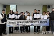 광장일보 주재영 기자 | 대구 동구청은 지난달 31일 동구청년센터에서 ‘청년 창업기업 사무실 임차료 지원사업’ 선정 기업들과 협약을 체결하고 본격적인 지원에 나섰다. 임차료 지원사업은 공모를 통해 관내 7년 이내 초기 창업기업 9개사를 최종 선정했으며, 선정 기업들은 최대 10개월간 50만원 한도 내에서 월 임차료의 50%를 지원받게 된다. 임차료 지원 사업은 아이디어와 기술력을 보유하고도 초기 자본 부족과 고정비 부담으로 어려움을 겪는 청년 창업가들에게 월 임차료의 일정 부분을 지원해 폐업률을 낮추고 성장을 돕는 맞춤형 지원 정책이다. 지난해 처음 시행돼 15개 창업기업을 지원했으며, 청년 창업가들이 절감된 비용을 사업에 재투자해 기업 경쟁력을 강화하기도 했다. 김태운 동구청장 권한대행은 “청년들이 우리 지역 사회에 안착하고 성공적인 창업가로 성장할 수 있도록 꾸준히 돕겠다”고 말했다.