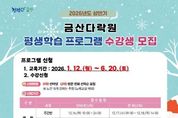광장일보 주재영 기자 | 금산다락원은 군민 전 계층의 수요를 반영한 2026년 상반기 평생학습 프로그램 수강생 954명을 오는 16일부터 24일까지 모집한다. 이번 프로그램은 아동·성인·노인·문해 총 4분야 76개 강좌가 준비됐으며 내년 1월 12일부터 6월 20일까지 금산다락원 평생학습관에서 진행될 예정이다. 금산다락원·금산군평상학습포털 온라인 신청 기간은 △16~17일 성인(컴퓨터자격증반, 요가 등 36강좌) 분야 △18일~19일 아동(트니트니, 트윈클 영어발레 등 21강좌) 분야이며 접수 이후 잔여 정원에 한해 전화 접수를 운영할 예정이다. 금산다락원 평생학습팀 방문 접수 일정은 △15~19일 노인(실버요가, 전통악기 등 15강좌) 분야 △19일 문해(한글교실 2강좌) 분야 등이다. 노인 분야 강좌는 오는 22일 오전 10시 생명의집 소공연장에서 추첨으로 대상자를 선정한다. 금산다락원 관계자는 “평생학습이 단기간의 교육에 그치는 것이 아니라 지속적인 자기 계발과 학습으로 이어지도록 최선을 다하겠다”고 말했다.