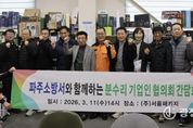 광장일보 주재영 기자 | 파주소방서는 3월 11일 오후 2시 파주시 광탄면 분수리 공장 밀집지역 관계자를 대상으로 안전점검과 간담회를 실시했다. 이날 간담회에는 김명찬 파주소방서장과 예방대책팀장, 광탄119안전센터장 등 소방 관계자, 분수리 기업인 협의회 관계자들이 참석해 공장 밀집지역 화재예방 방안을 논의했다. 분수리 자생산업단지는 약 1.07㎢ 규모에 260여 개 사업장이 밀집해있으며. 약 2천여 명의 근로자가 근무하고 있어 평소 화재예방과 초기 대응체계 강화가 중요한 곳이다. 이에 따라 소방서는 관계자와의 소통을 바탕으로 현장 중심 예방활동을 이어가고 있다. 이날 간담회에서는 산업단지 일반현황과 주요 화재 위험요인을 공유하고, 공장 밀집지역의 특성을 반영한 화재예방 방안을 논의했다. 이후 공단 일대 현지 시찰을 통해 주요 위험요소를 직접 확인하고, 화재 피해 저감 방안을 모색했다. 또 기업 관계자들에게 소화기와 단독경보형감지기 사용법, 전기화재 주의사항, 콘센트 화재 방지 스티커 활용법 등을 안내하고, 파주 관내 기업 대상 오픈채팅방 운영을 소개하며 화재예방 정보 전달 체계도 함께 설명했다. 김명찬 파주소